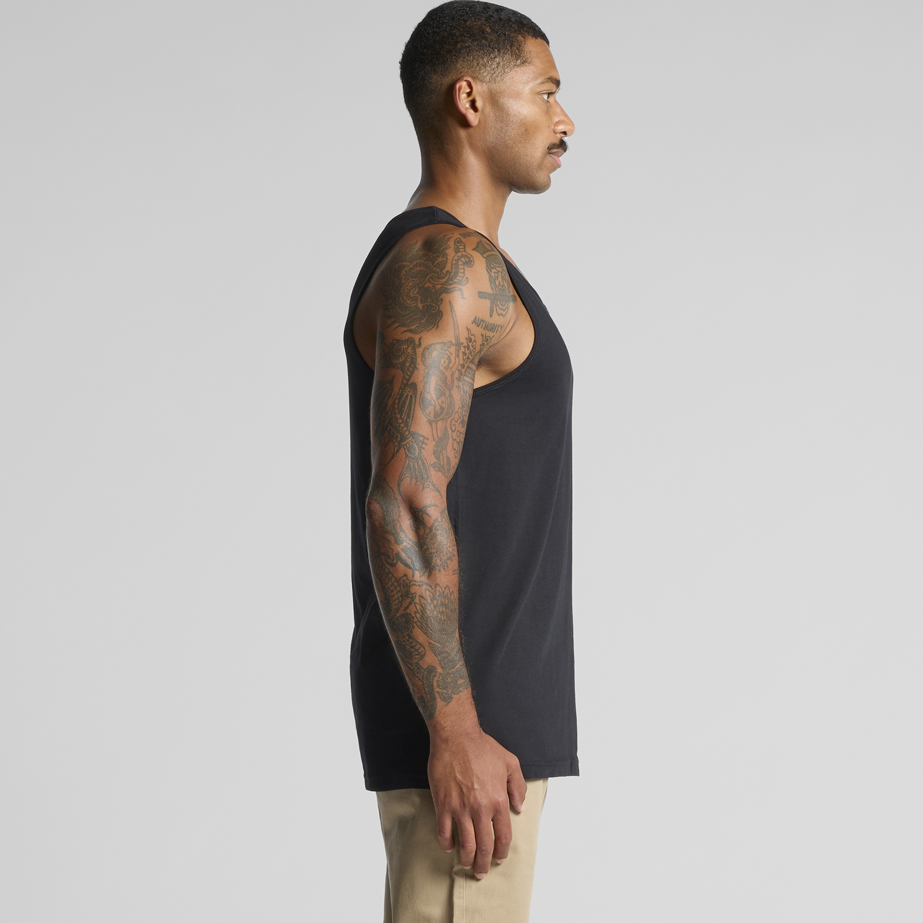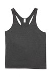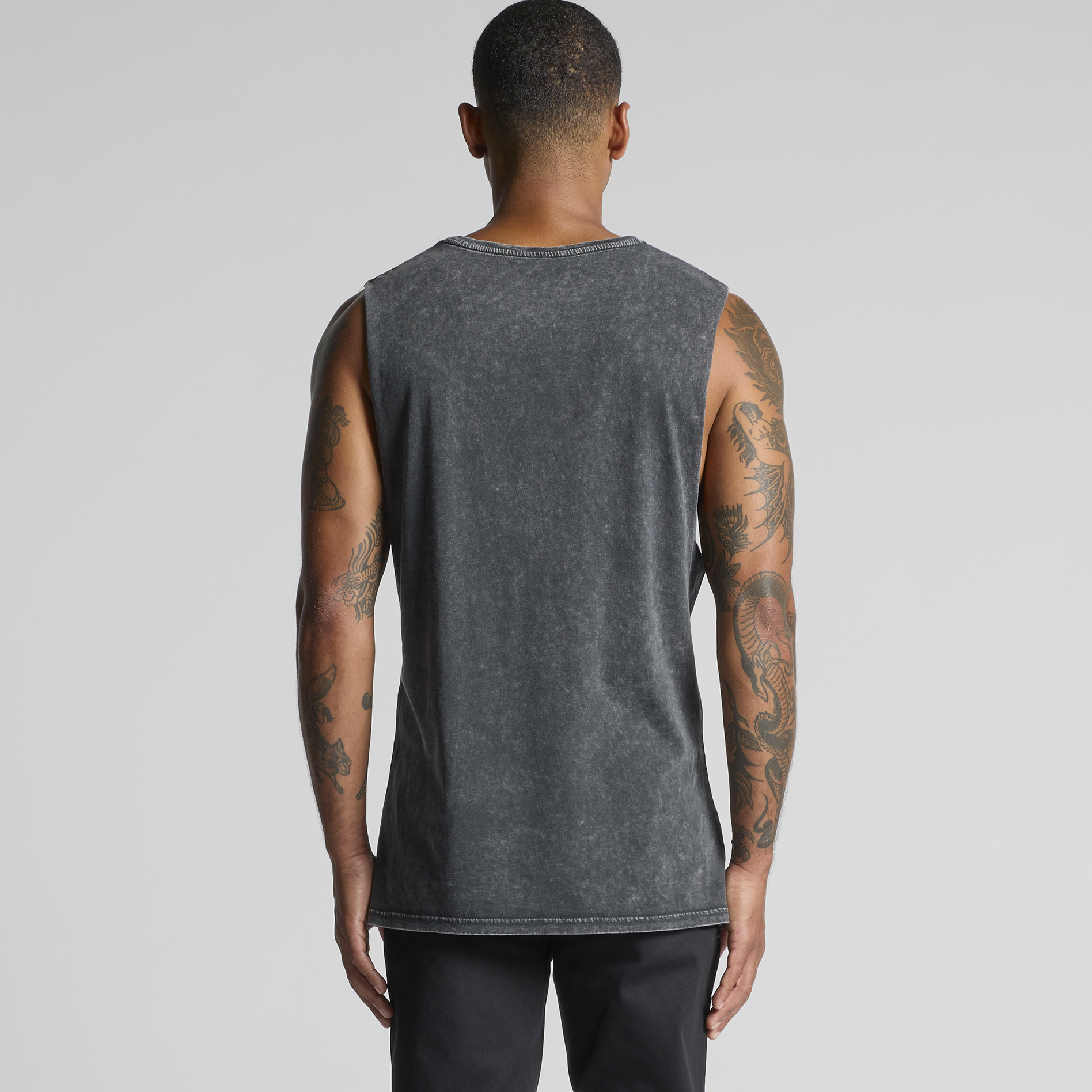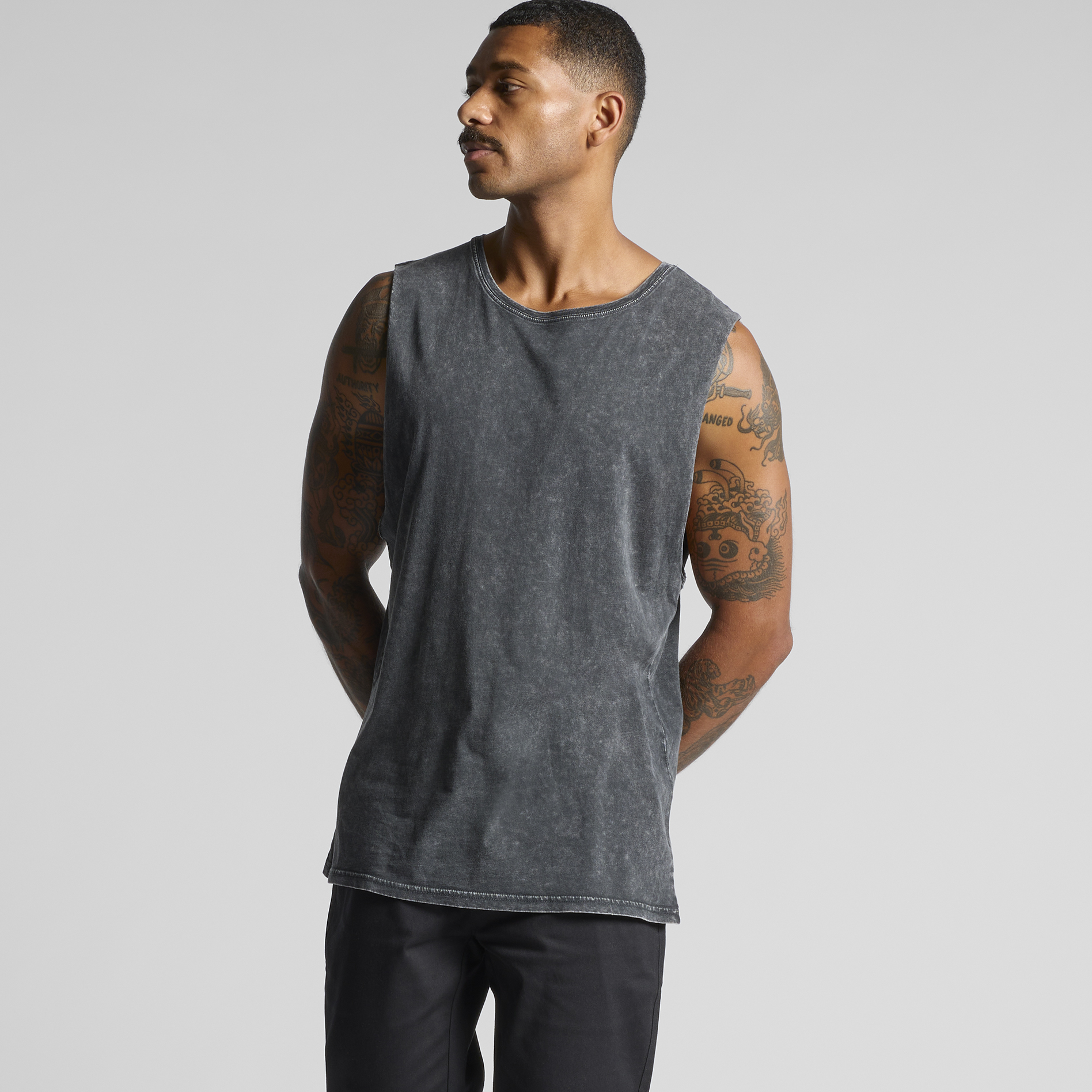Sleeveless tank, raw armhole edges, stone wash finish with a worn look